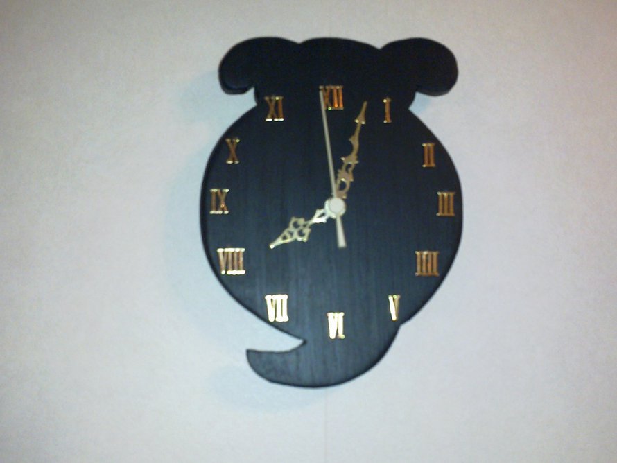 Tässä kuvassa on edesmennyt koiramme pentuna. Kellon on veistänyt puutyötunilla tyttäremme, yli 15 vuotta sitten. Aivan ihanan omaperäinen seinäkello, tästä en luovu.