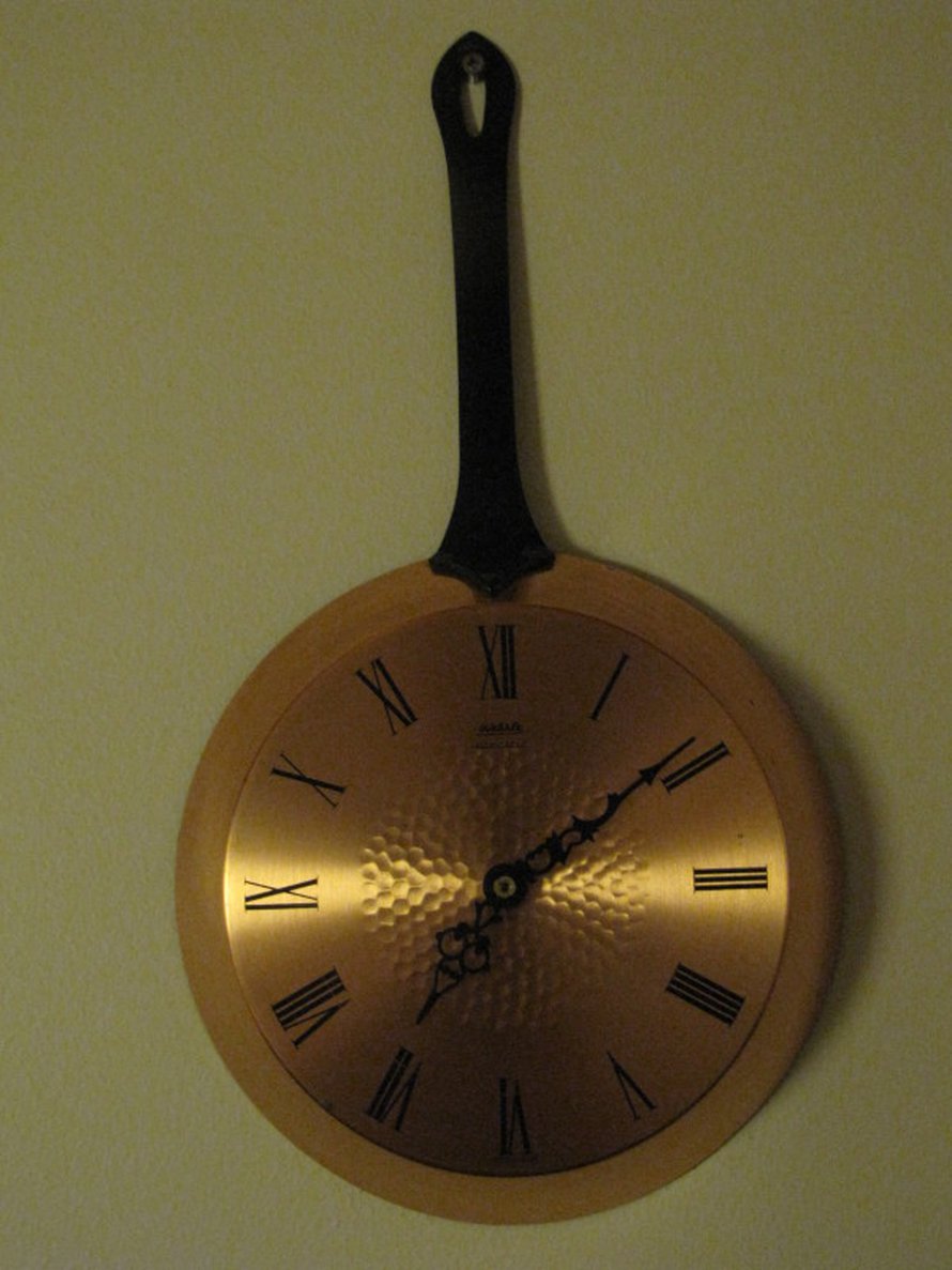 Näin tuli hyödynnettyä paistinpannusta molemmat puolet. Vitsi-vitsi ! Keittiönkello on yksi muisto appivanhempieni kelloliikkeestä.