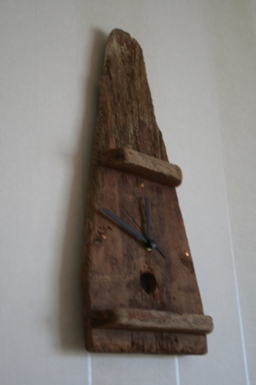 Tämä puupala löytyi järvestä kellumasta.Kotona siihen lisättiin pari naulaa ja kellon koneisto,niin syntyi olohuoneen kello...