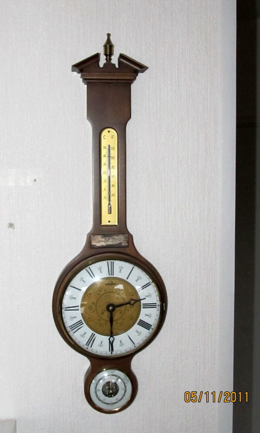 Seinäkello on vuodelta 1969, mieheni sai sen ylioppilaslahjaksi kummisedältään. Kello näyttää aikaa hyvin ja samalla siinä on lämpomittari ja ilmapuntari.