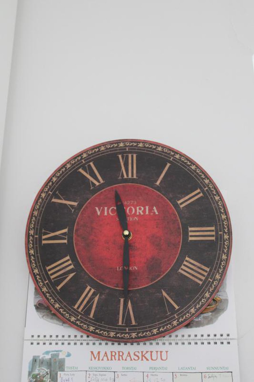 Tämän halpiskellon olen ostanut puhtaasti ulkonäkösyistä: siinä on kaunis punainen, ja sen Victoria-teksti tuo mieleen ammoiset, kitkeränsuloiset au pair -ajat Lontoossa. Samaan naulaan on sopinut myös kalenteri.