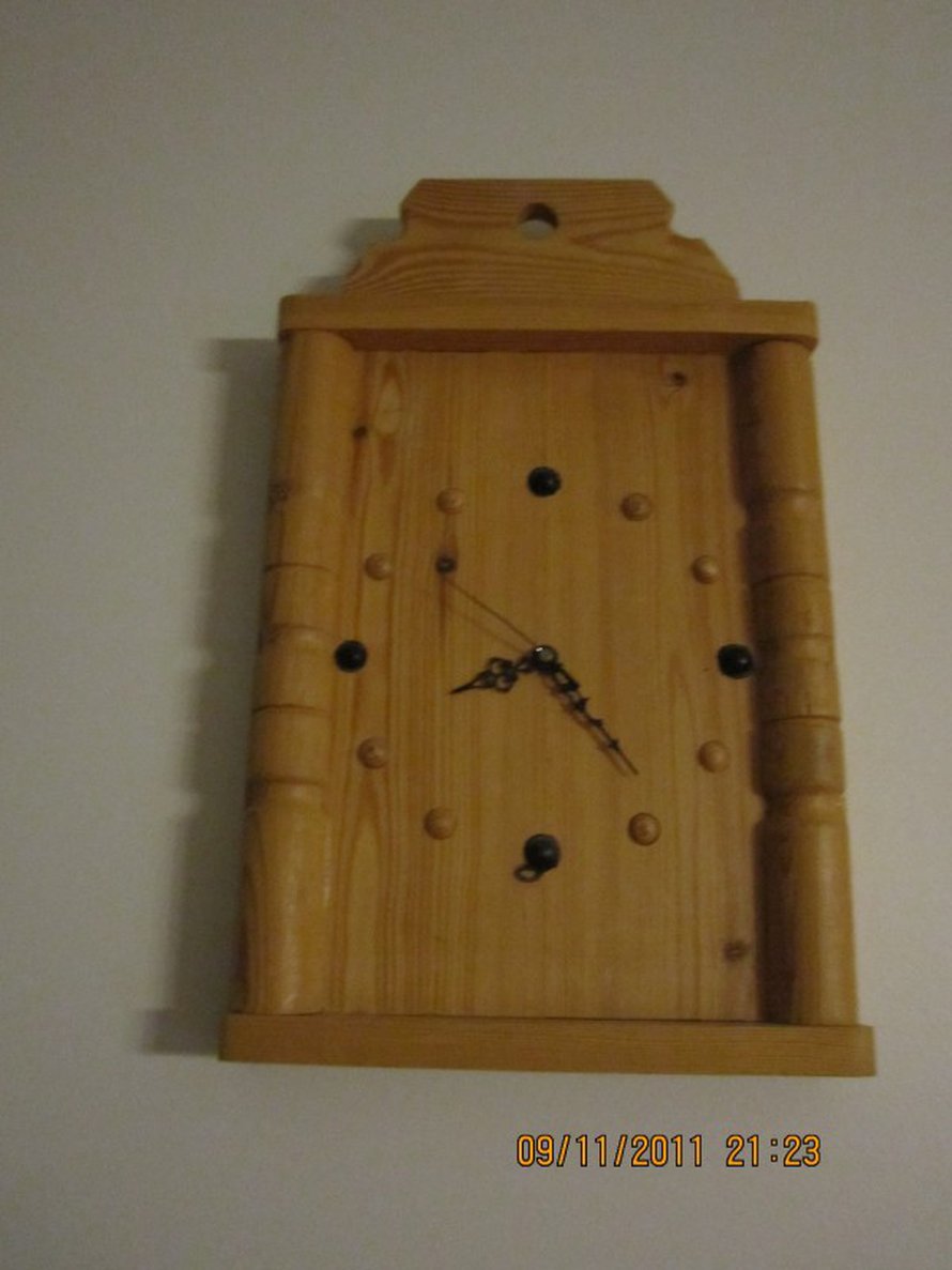 Tämä kello on minulle erittäin tärkeä ja rakas, kellon tehnyt poikani Toni ala-asteella kuudennella luokalla. Nyt kellolla on ikää 12 vuotta. Kello mittaa aikaa erittäin tarkasti. Tosin kellosta kuuluu käyntiääni,kuten hyvän kellon kuuluukin raksuttaa. Mielestäni kello on kaunis ja selkeästi katsottava. Toivottavasti minulla kellolla on vielä pitkä yhteinen taival.