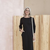Tiimalasin muotoinen, vartaloa kevyest muotoileva mekko.
