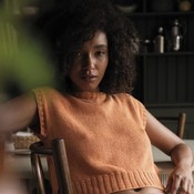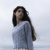 Väljä, ylhäältä alas neulottu toppi.