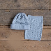 Pitsineuleinen pipo (pääymärys 54-58 cm) ja kauluri (ympärys 76 cm).
