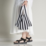 Mustavalkoinen virkattu kassi, leveys 32 cm, korkeus 45 cm.