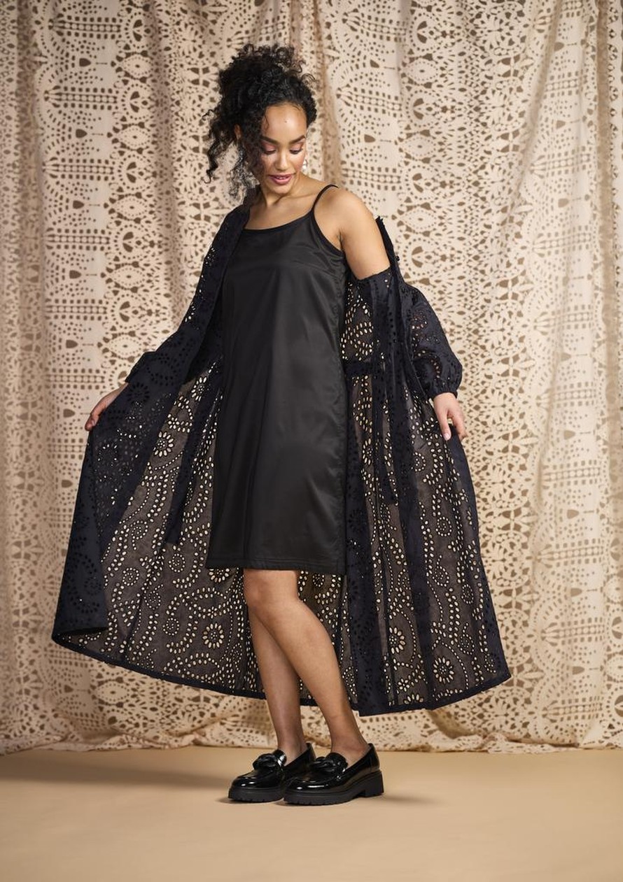 Dekolteen ja olat paljastava alusmekko.