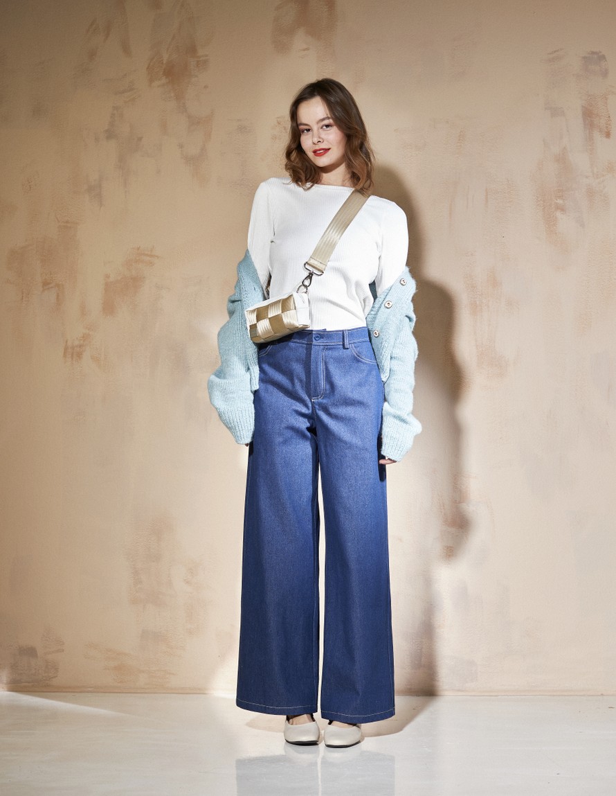 Vyötärölle nousevat, lantiolta napakat ja leveälahkeiset farkut.