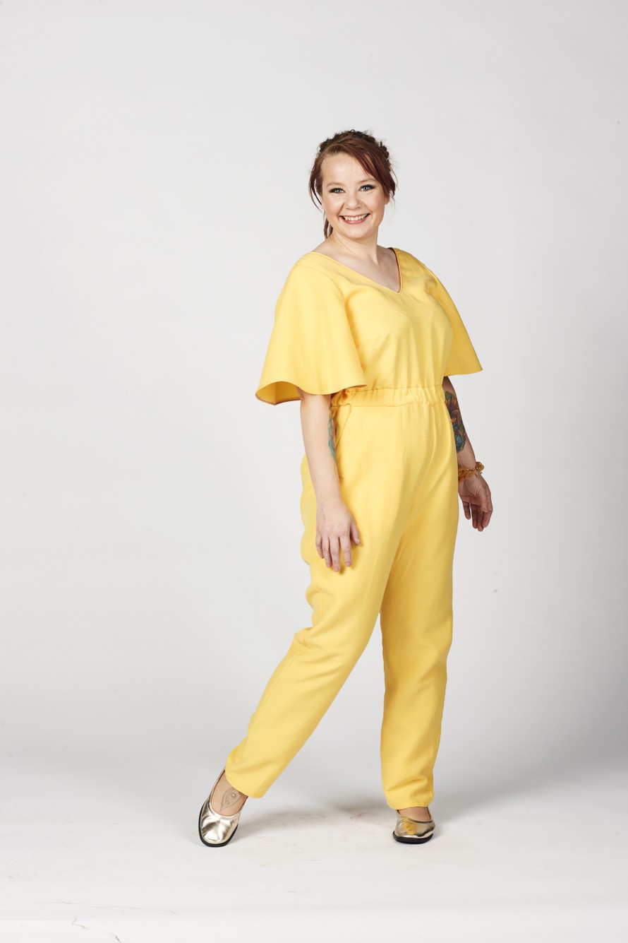 Pitkälahkeinen haalari, jossa hulmuavat hihat.