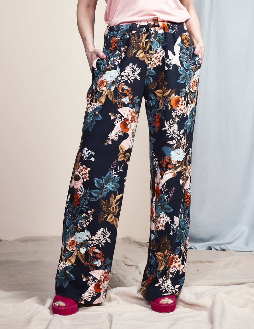 Kuminanauhavyötäröiset kukikkaat trikoohousut.
