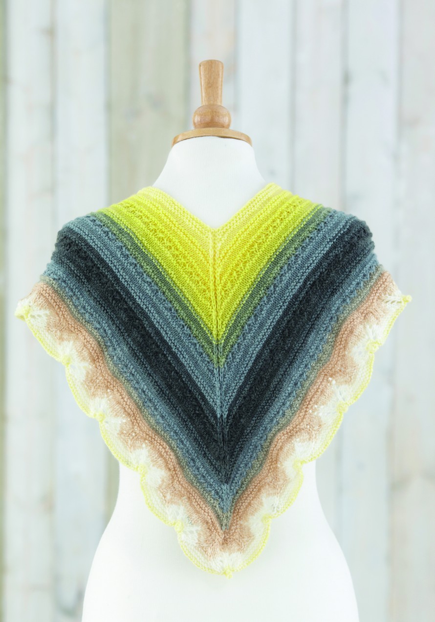 V-muotoinen neulottu pitsihuivi.
