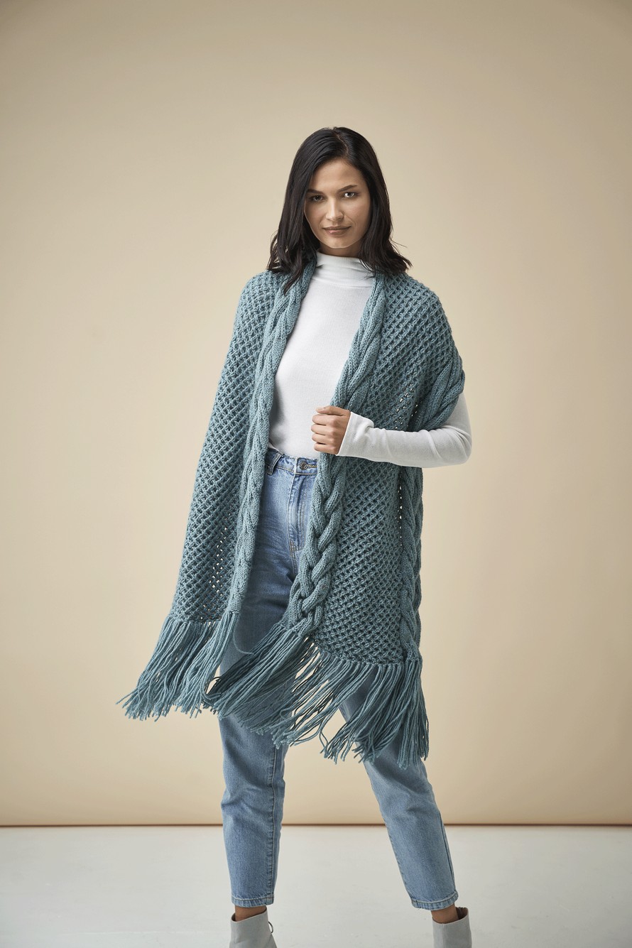 Huivi isoilla palmikkolaidoilla.