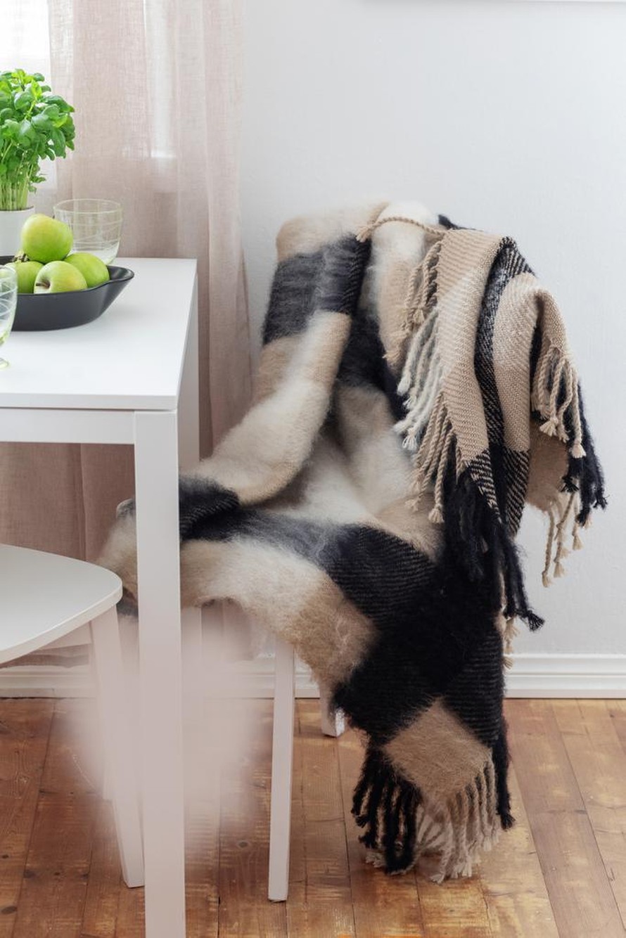 Pörröisen pehmeäksi karstattu villahupa, koko 135 x 182 cm.