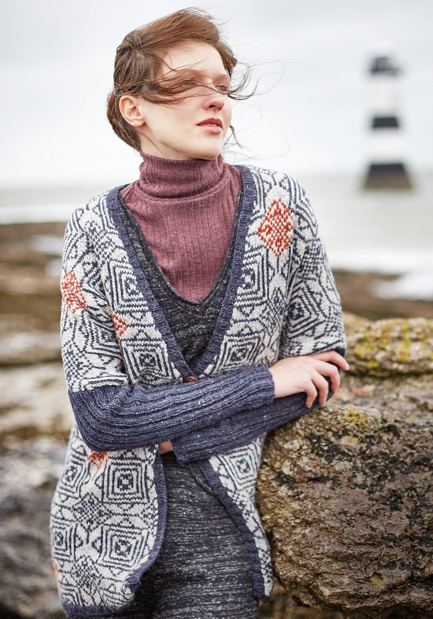Suuri Käsityö 1/2017 s. 60Kirjoneulevillatakki, jossa kapeat joustinneulehihat.