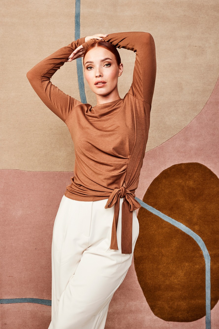 Laskoksilla ja rusetilla koristettu t-paita.