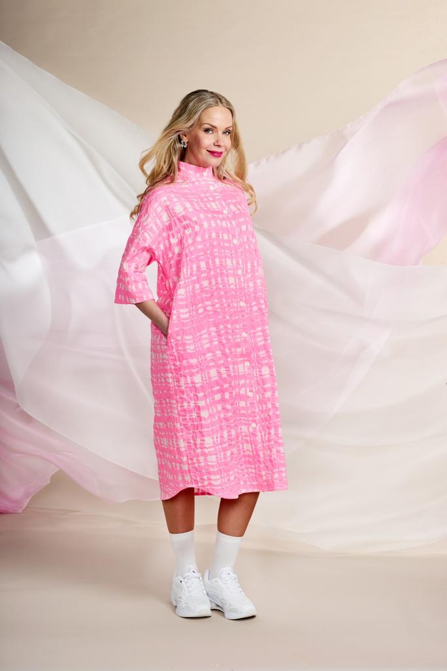 Pystykauluksellinen, suoralinjainen paitamekko.