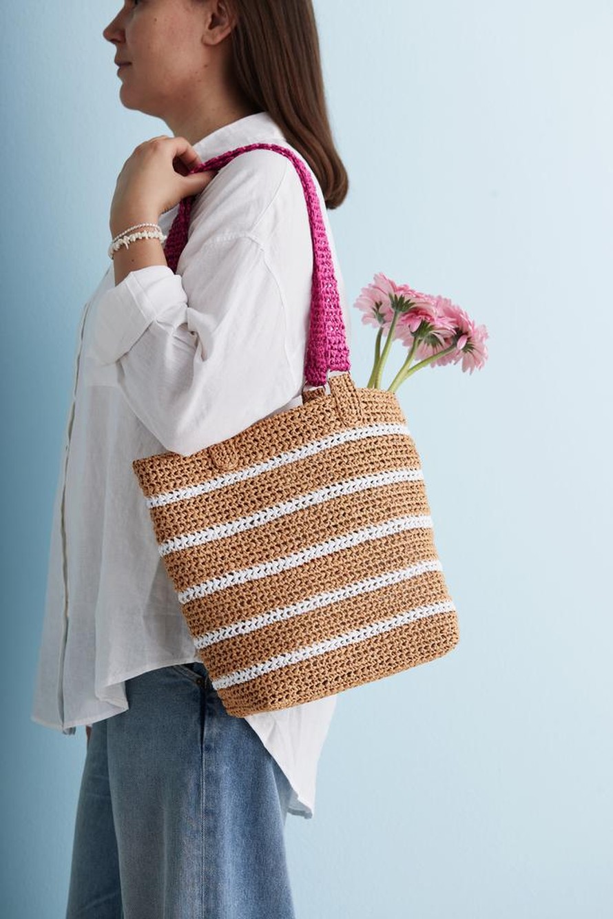 Kesän kepein virkattu raitakassi, leveys 34 cm, korkeus 31 cm ja syvyys 10 cm.
