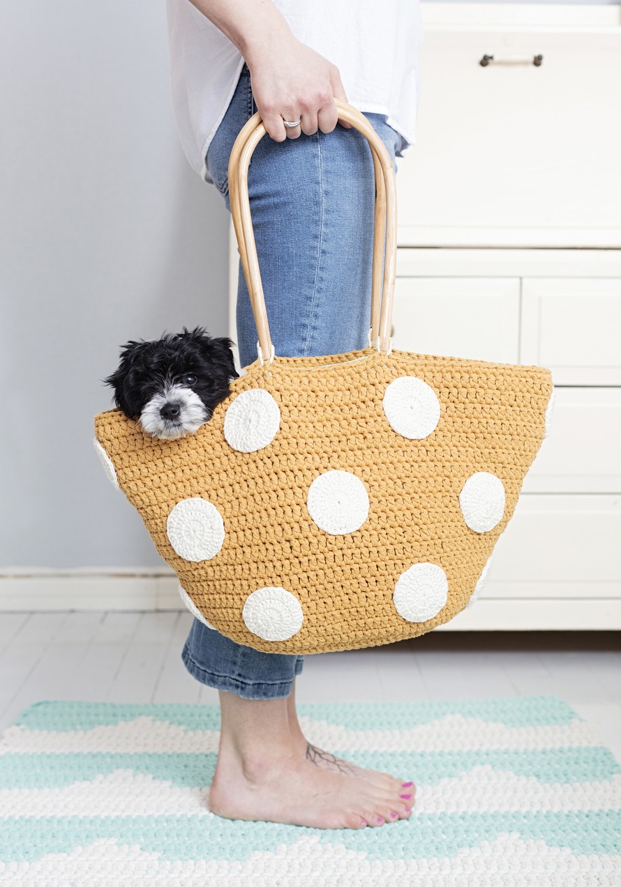 Virkattu iso kassi rottinkikahvoilla.