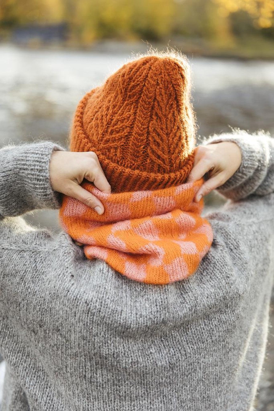 Kaksivärinen, tikapuutekniikalla neulottu kauluri.