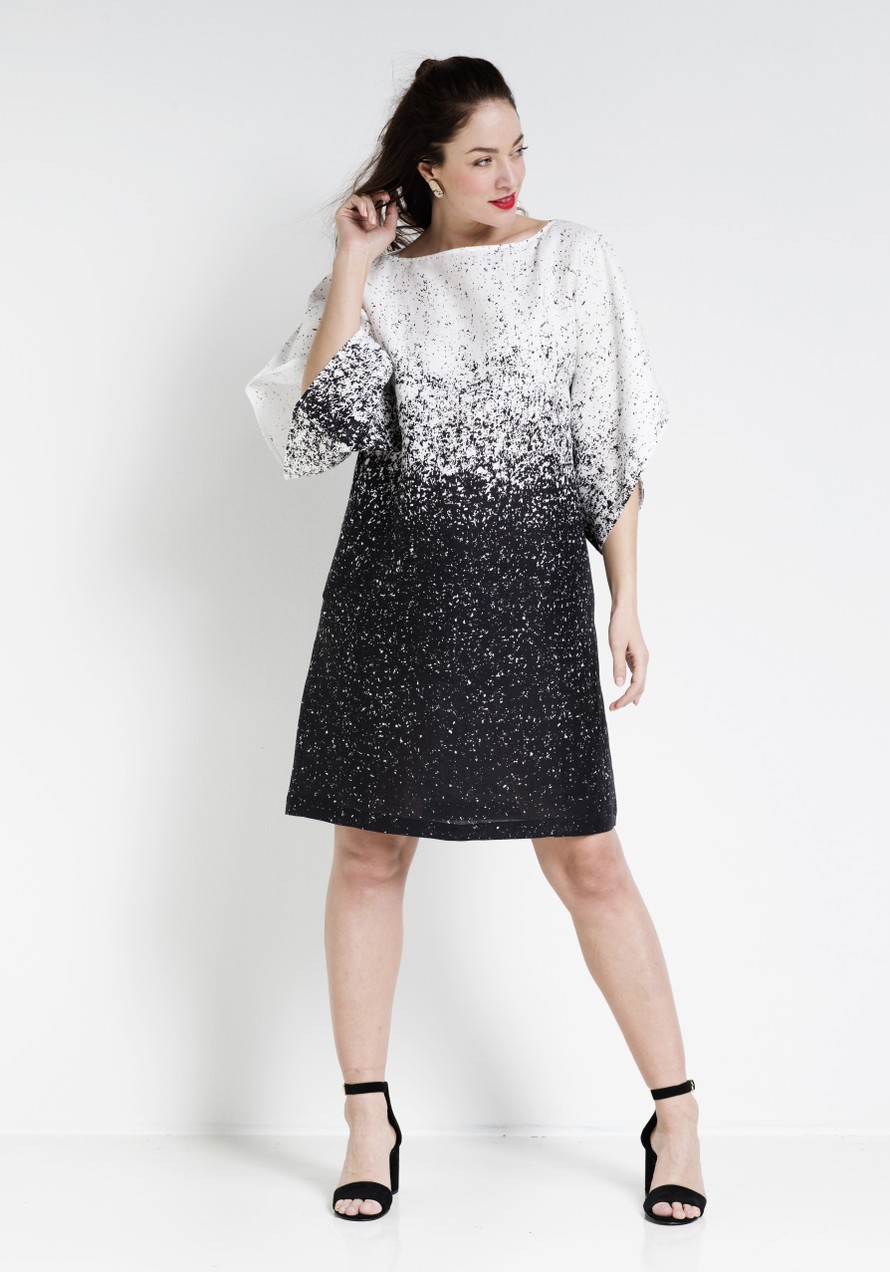 Kimonomekko, jossa venepääntie ja sivusaumataskut.