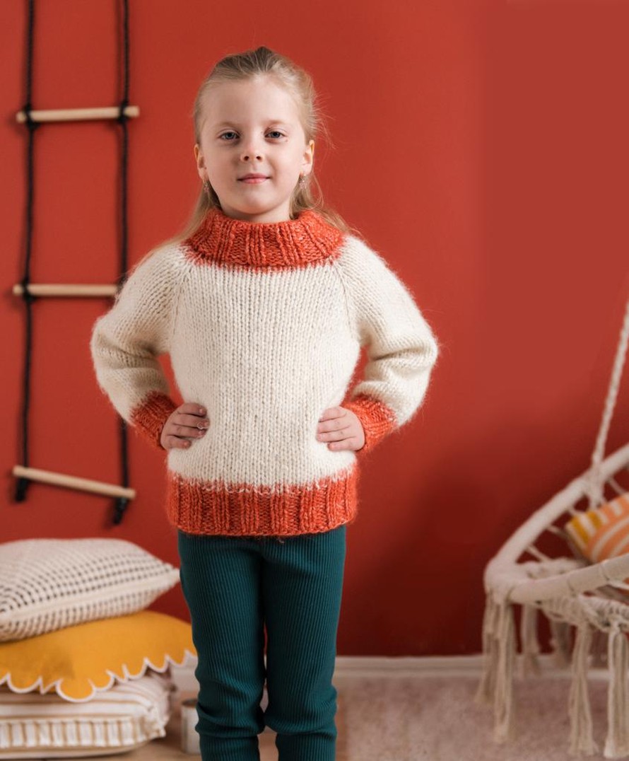 Kaksinkertaisella langalla neulottu lapsen pusero.