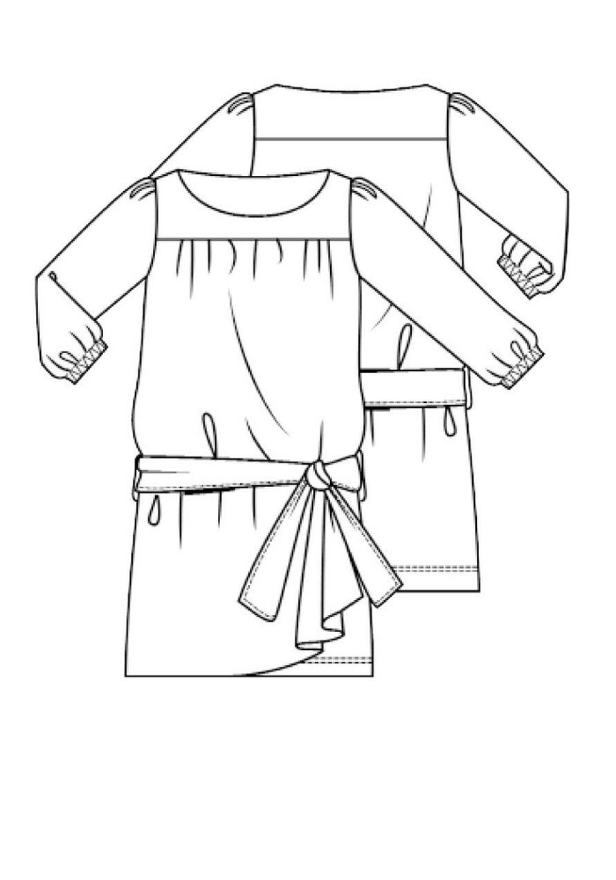 Suuri Käsityö 10/2013 s. 15Poikkileikkaus rinnan yläpuolella, poimutettu keskiosa, alennettu vyötärö 20-luvun tyyliin.