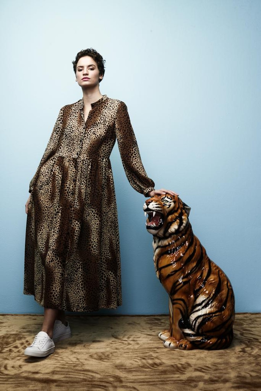Selkeälinjainen mekko, jossa on pallohihat.