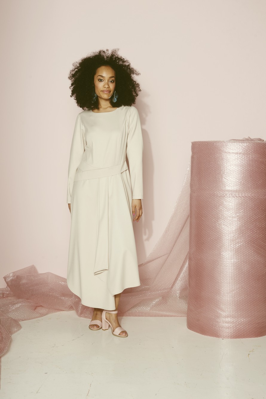 Pitkähihainen, tyylikäs laskosmekko.