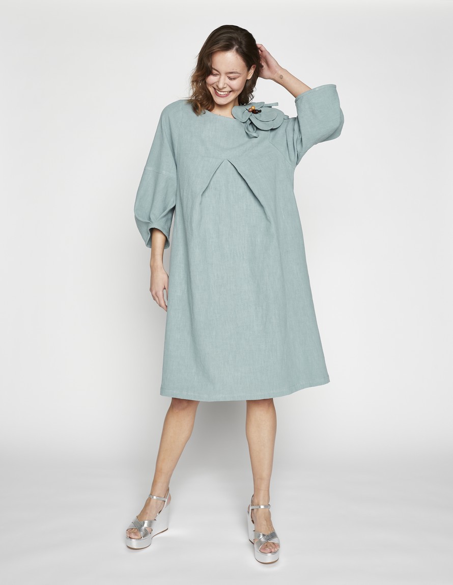 Väjä, pellavakankaasta ommeltu Ruth-mekko, jossa veistokselliset hihat.