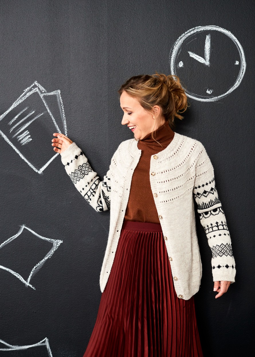 Hillitty neuletakki, jossa kirjoneuletta hihoissa.