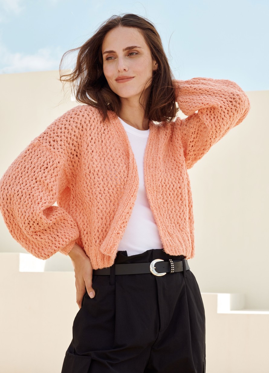 Lyhythelmainen, pitsinen ja keväinen neuletakki.