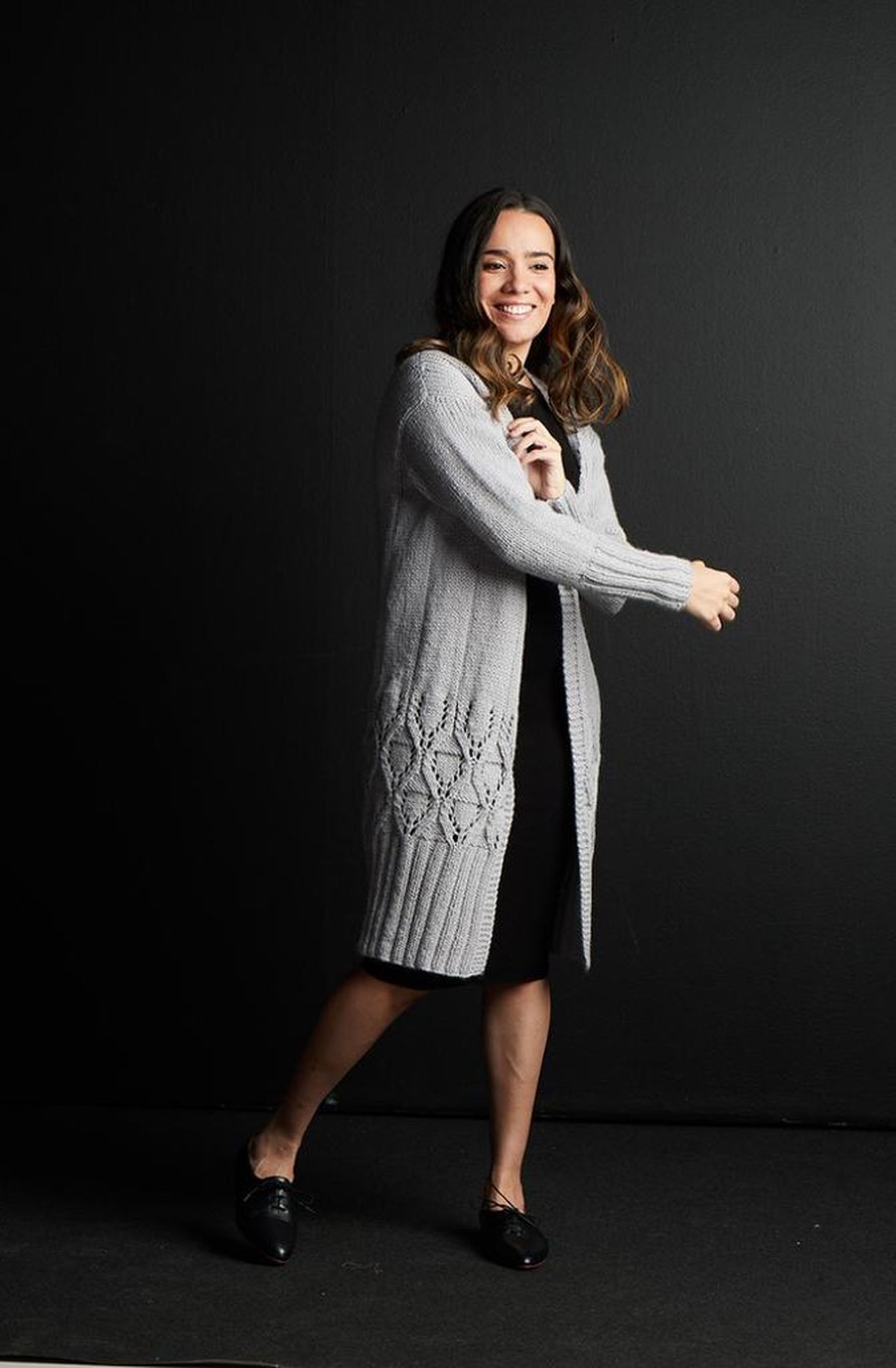 Pitkä neuletakki, jossa kaunis graafinen pitsikuvio helmassa.