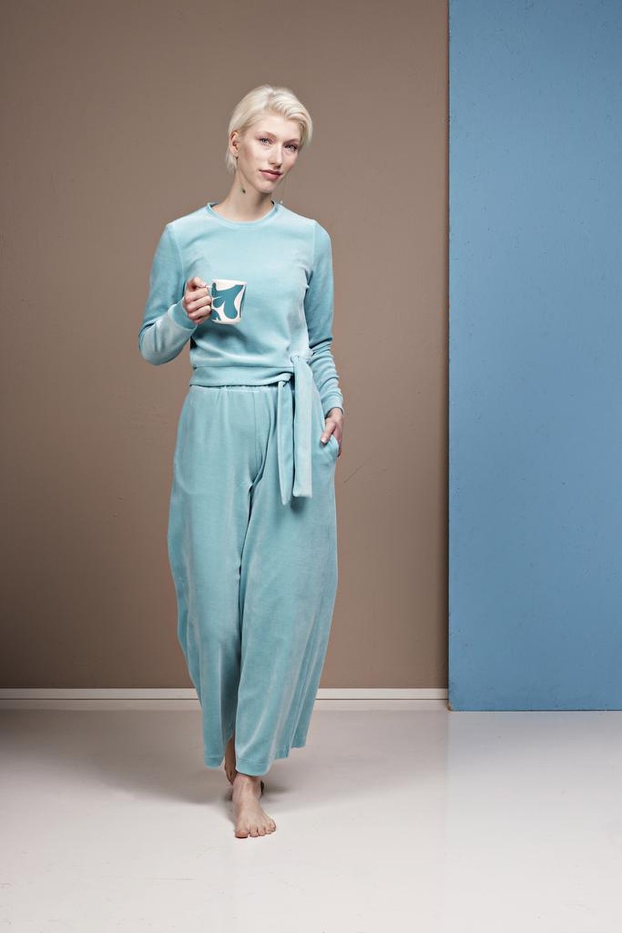 Samettinen oloasu - pusero ja leveälahkeiset housut.