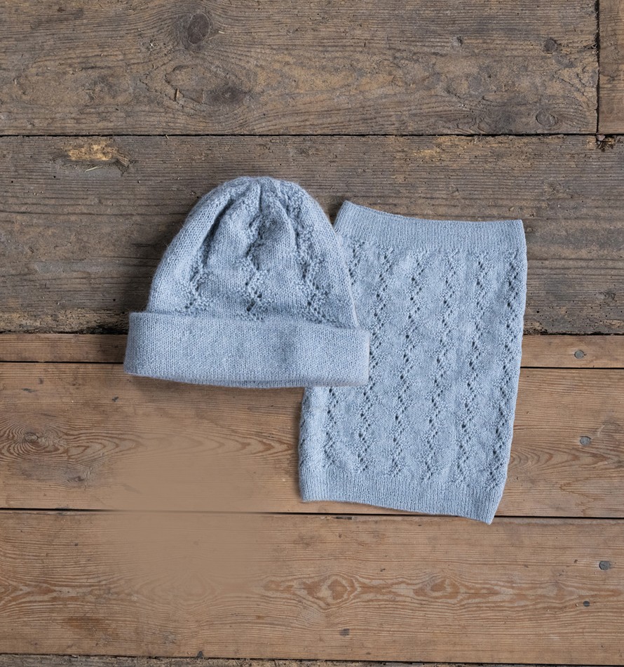 Pitsineuleinen pipo (pääymärys 54-58 cm) ja kauluri (ympärys 76 cm).