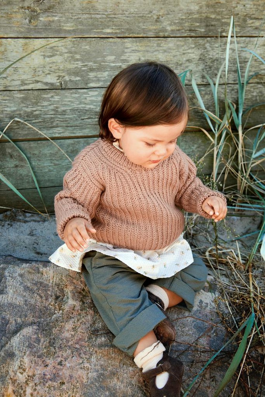 Puolipatenttineuleella neulottu kaunis ja nykyaikainen lasten pusero. Koot 3 kk - 4 v.