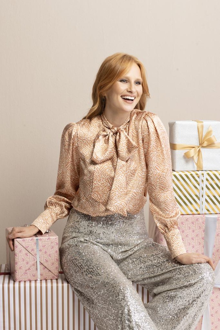 Klassinen, suoralinjainen satiinipaita, jossa rusetille sidottava kaulus.