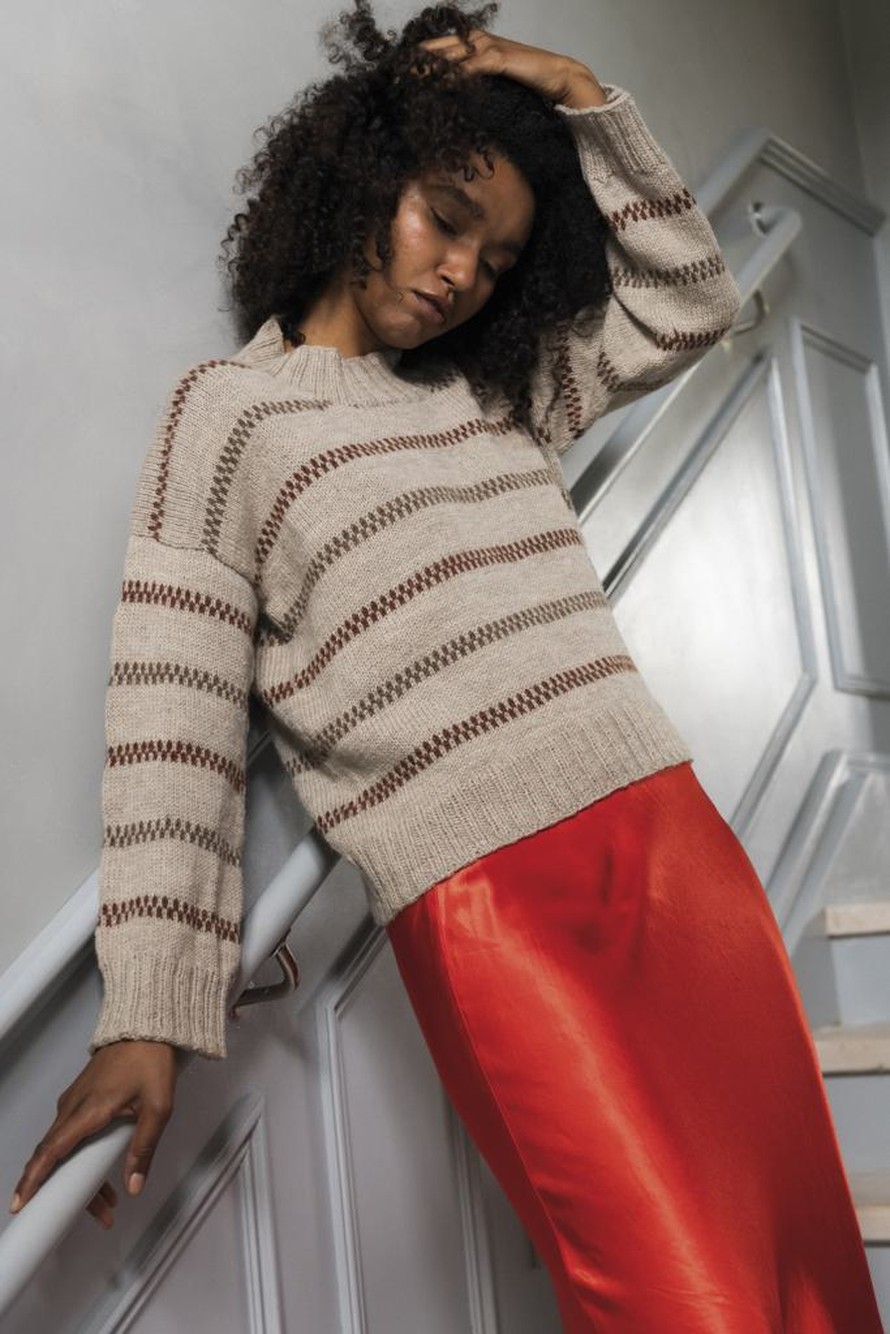 Rento ja väljä kirjoneulepusero.