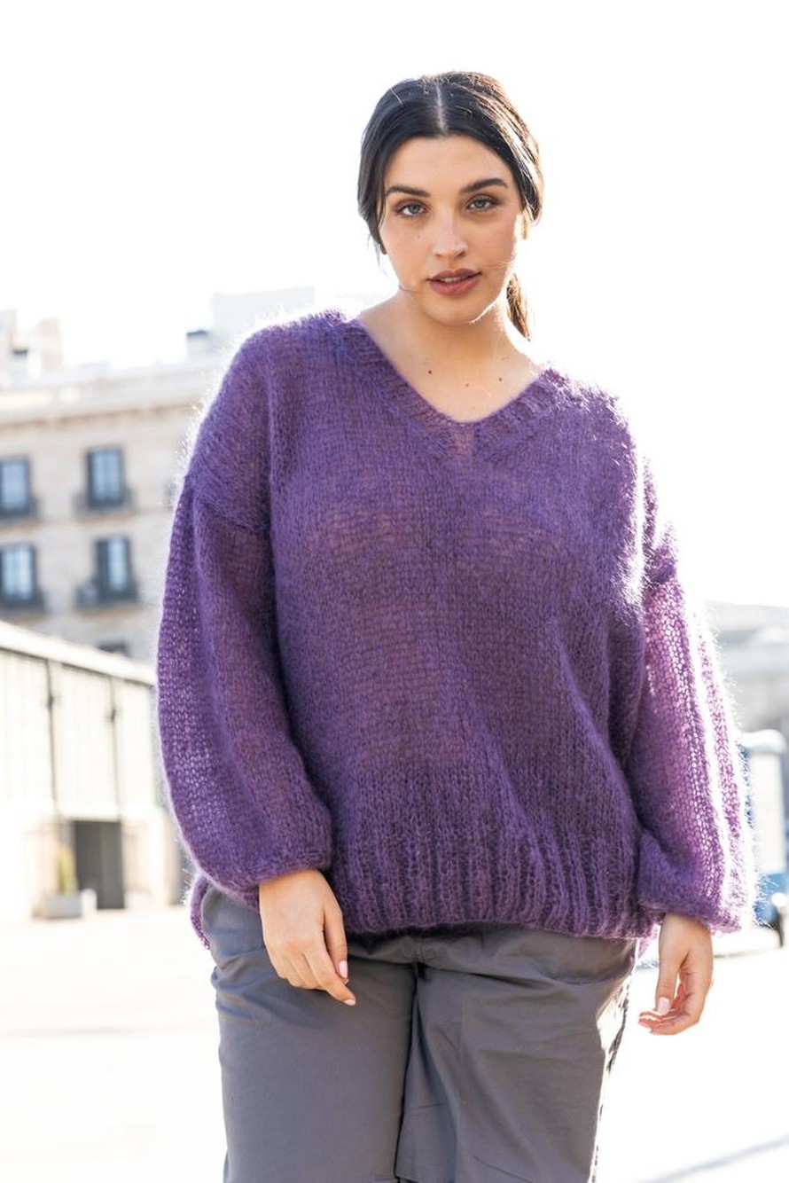 Superpaksuilla puikolla neulottu Laventeli-pusero.