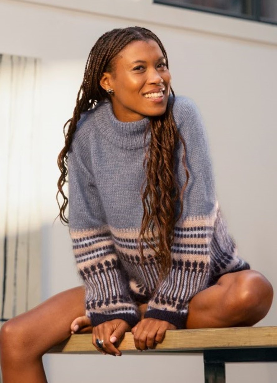 Ylhäältä alas ommeltu kuvioneulepusero.