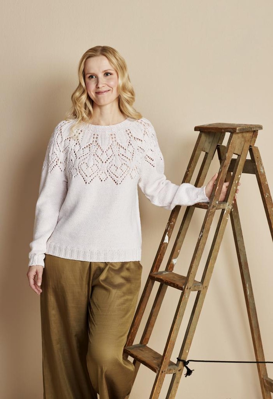 Merja Ojanperän sydänkuvioinen neulepusero.
