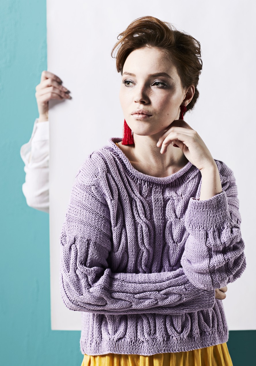 Leveä ja vyötärömittainen palmikkoneulo.