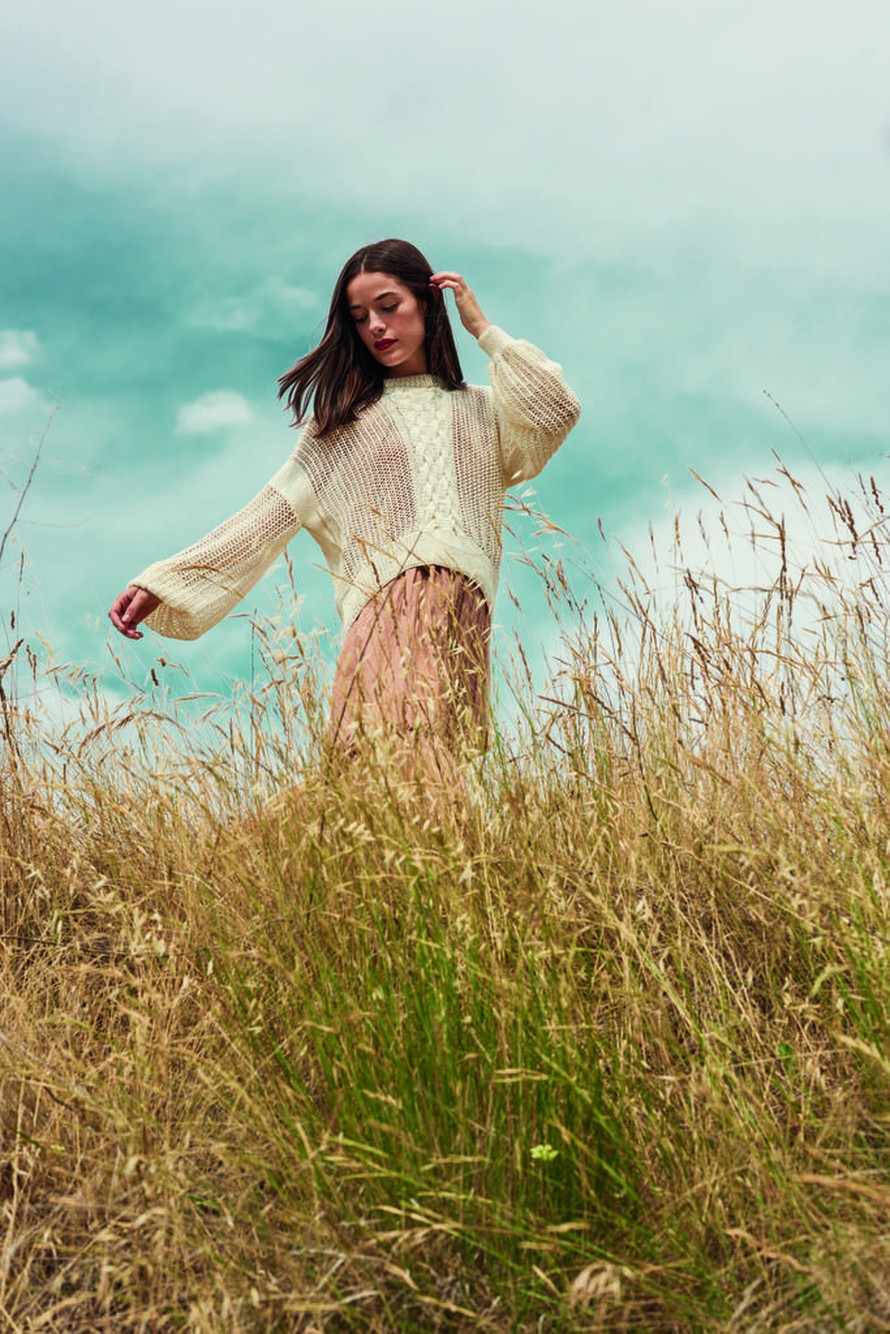 Pusero, jossa yhdistyy pitsi- ja palmikkoneule.