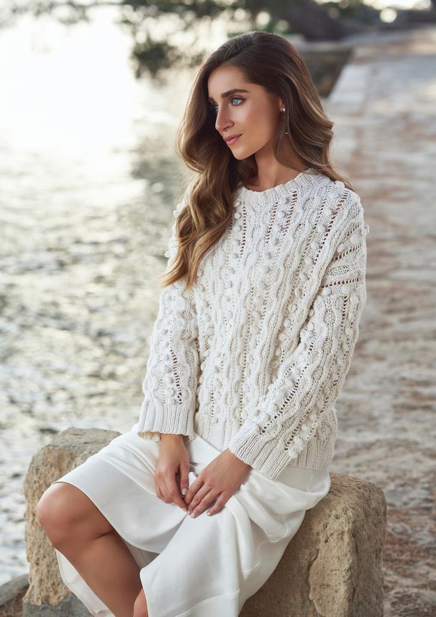 Pusero, jossa on palmikoita, pallukoita, pitsiä ja helmineuletta.