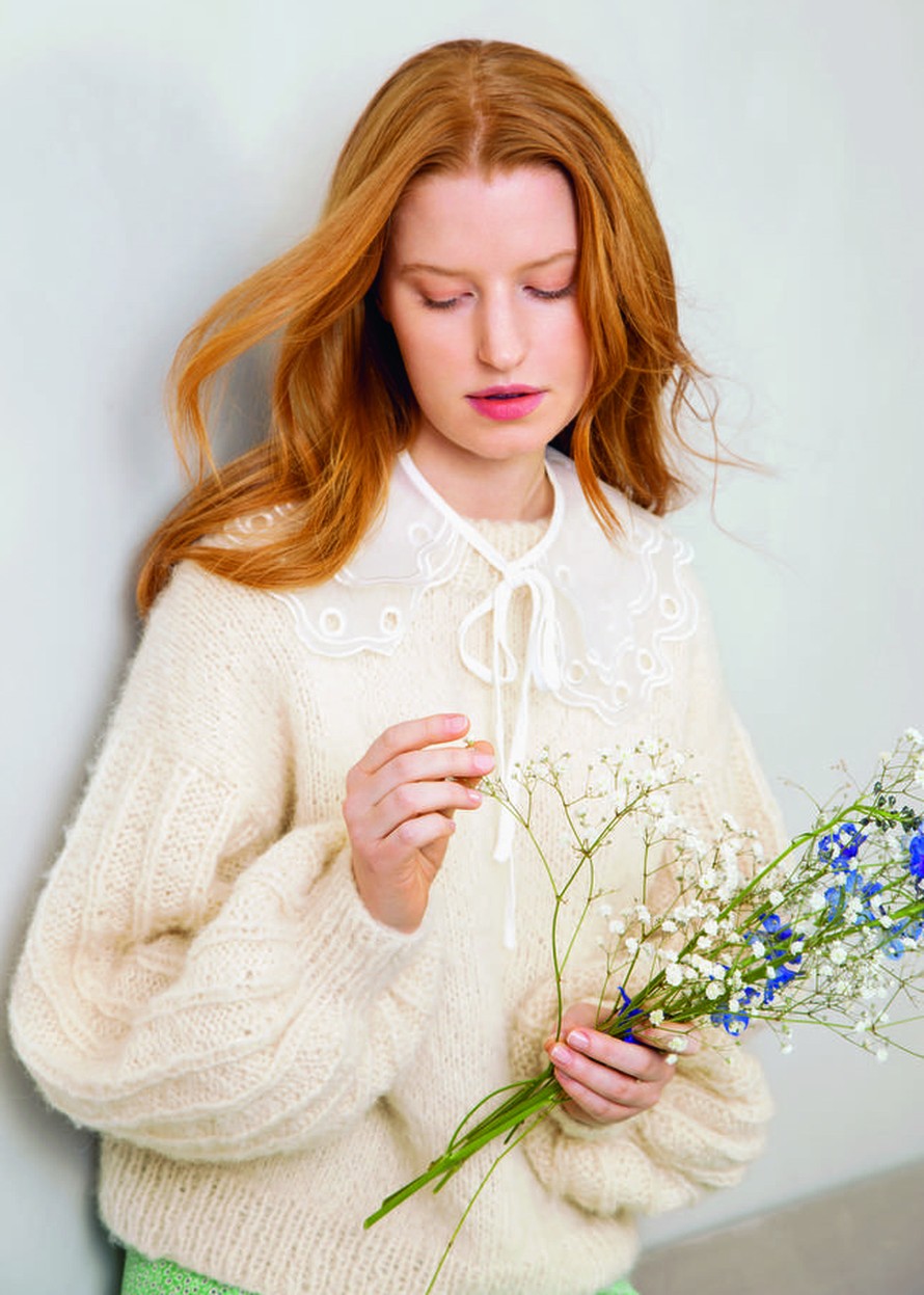 Klassinen neulepusero pulleilla, pystyraidallisilla hihoilla.