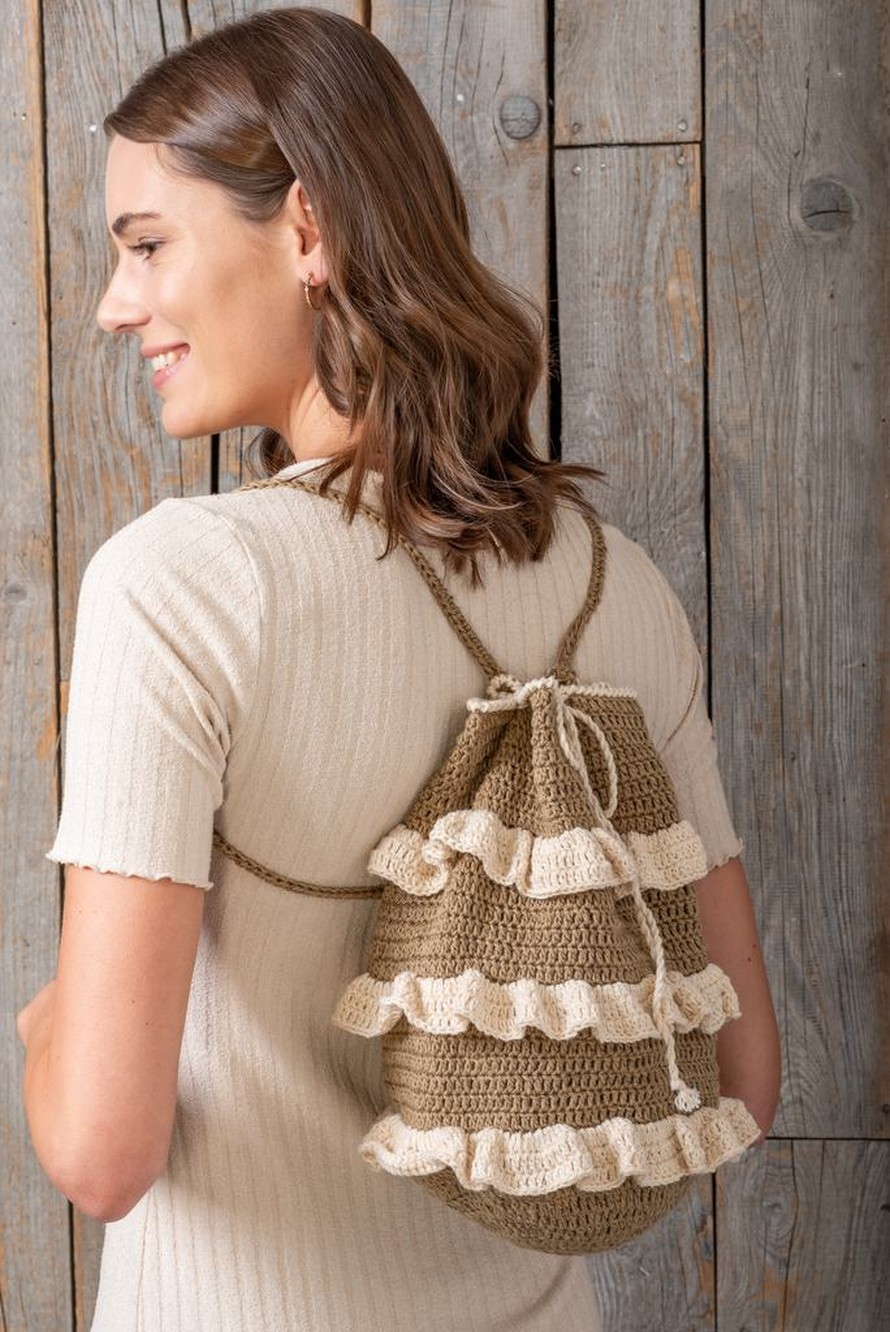 Virkattu röyhelöreppu, koko 28 x 35 cm.