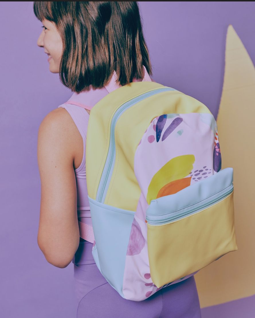 Ommeltu selkäreppu, korkeus 35 cm, leveys 26 cm, syvyys 13 cm.