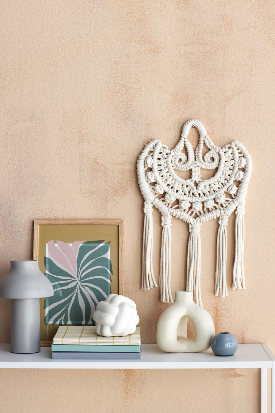 Makramee-tekniikalla tehty puolikaaren muotoinen seinävaate.