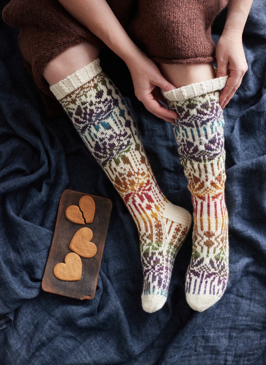 Merja Ojanperän suunnittelemat pitkät Dallilja-sukat, koot 37/38 ja 39/40.