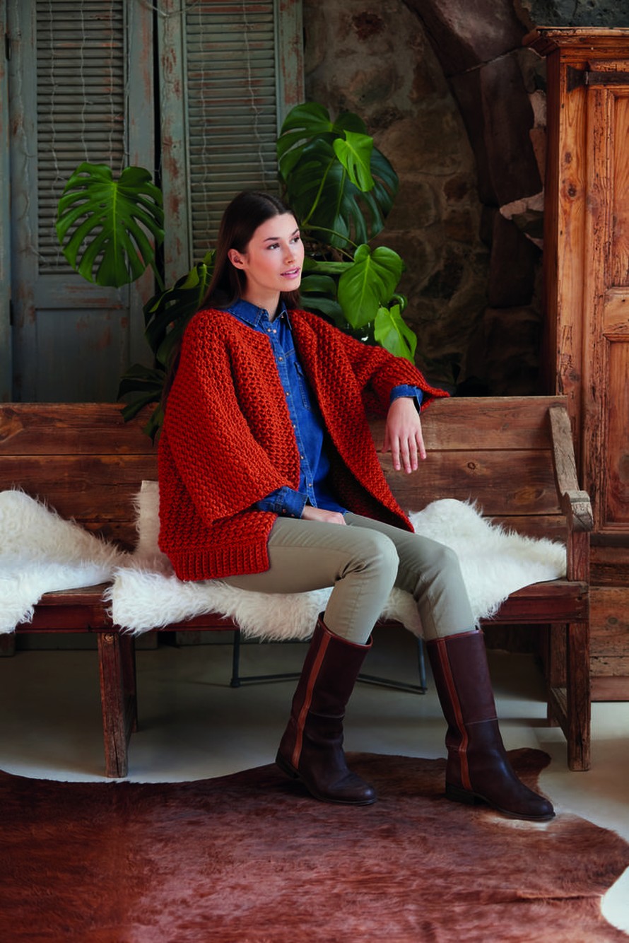 Reilun kokoinen virkattu takki.