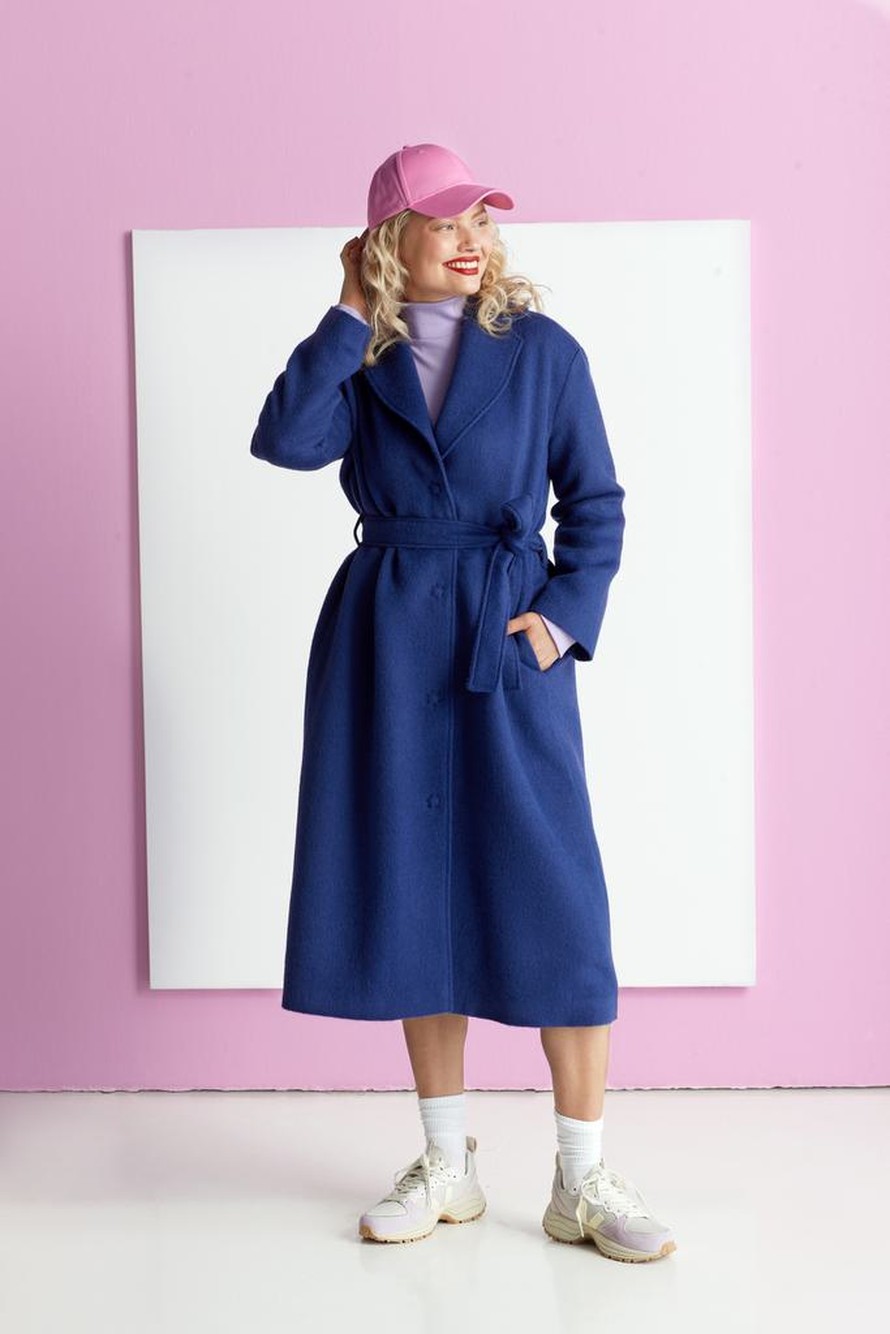 Shaalikauluksinen, suoralinjainen villakangastakki.